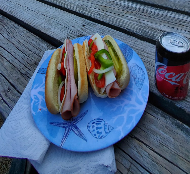 The upper lake was just 50 yards from my camp site, so I hiked around the lake the first afternoon. The steep hill to the trail around the lake provided a panoramic view of the campground Loop C, where I had set up camp. I had done a little grocery shopping on the way in, and after the hike I was ready to eat. I decided on my best spin on authentic Maine Italians for lunch/dinner.